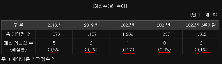 혹시 그거 아셨나요? 닭다리, 윙으로만 판매하는 치킨이 교촌이 최초라는 것을요. 가슴살 먹기 싫어하는 사람 대부분이었는데, 맛있는 부위만 구성하니 소비자들이 안 찾을 수가 없겠죠. 그래서, 교촌치킨 가맹점들 모두 연평균 7.5억(2021년기준) 매출액 찍는다고 하네요. 그리고 그거아셨나요? 교촌치킨 CF를 보면 사람이 안나와요. 제품위주로 광고마케팅을 벌이고 있는거죠. 비용절약도 되며 치킨에 더 집중되다보니 나름 성공적인 마케팅이란 생각이 듭니다. 이러니 가맹점주들이 떠날 수 없겠죠. 그래서 교촌치킨 가맹점 폐점률을 보면 상당히 낮은 것을 볼 수 있어요. 오히려 증가폭이 훨씬 크죠.