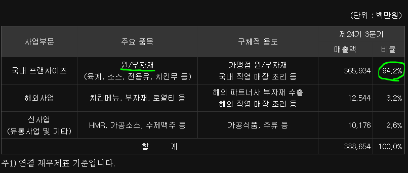 사진부터 보라고 했는데, 본사를 보고 어떤 생각이 드나요? 개인적을 깔끔하고 사무실만 있을 것 같은 느낌이 팍팍 들었습니다. 흔히, 옷벗겨진 닭들이 컨베이어벨트에 줄줄이 매달려있고 그것을 흰작업복을 입은 노동자들이 손질하는 모습이 떠오르는데, 하지만 이곳은 아닌 것 같죠? 교촌본사는 치킨을 생산하지 않습니다. 모두 외부업체로부터 사와서 가맹점에 유통판매하는 사업이 주입니다. 물론, HMR 시장이나 수제맥주사업에도 뛰어들었지만, 압도적으로 치킨유통으로 벌어들이는 돈이 많습니다. 아래 표를 한 번 보시죠.