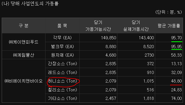 흥미로운 점은 소스 중 허니소스가 가동률이 가장 높다는거에요. 처음에 교촌치킨하면 허니콤보를 떠올렸다싶이 교촌치킨의 소스류 치킨에서는 허니치킨이 가장 잘 팔리는 것을 유추 할 수 있겠습니다. 참고로 위에 3개의 기업은 모두 교촌에프앤비의 자회사입니다. 케이앤피푸드는 무를 제조. 계림물산은 육계생산. 비에이치앤바이오는 소스 같은 식품개발하고 있죠.