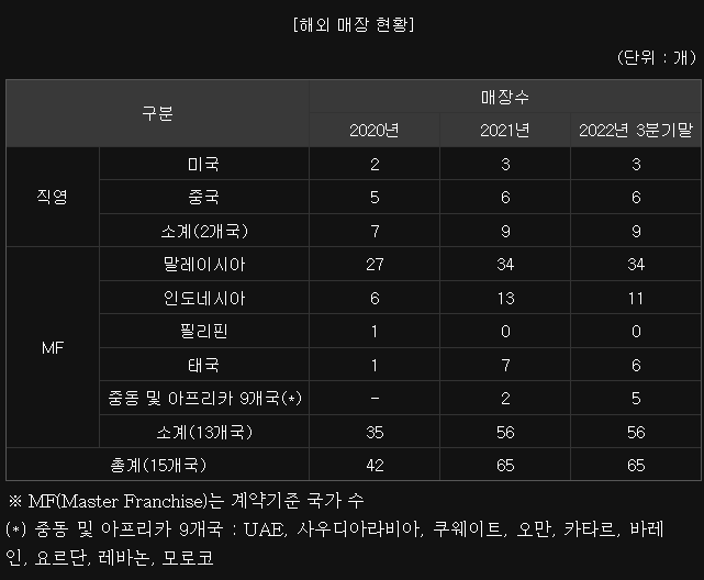 교촌본사가 직접 운영하는 해외장은 미국, 중국 뿐이고 9개 매장 정도 됩니다. 반면, 동남아시아 & 중동 같은 경우는 MF로만 진출했는데요. 추측하건데, 미국, 중국은 큰 국가이다 보니 그 만큼 정보가 많죠. 시장도 크고요. 그래서, 교촌이 직접 들어간 것 같습니다. 반대로, 동남아나 중동은 아직 성장단계라 교촌이 직접 가서 문화를 이해하고 채용을 하고 입지를 선정하는 것이 현지업체보다 더 잘 할 자신이 없었던 것 같습니다. 그래서, 해외매장은 MF가 압도적 비율입니다. 아래 참고하세요. 참고로, 말레이시아, 인도네시아가 많은데 이슬람국가이다 보니 돼지고기를 못먹죠. 그래서, 소, 닭에 대한 수요가 높아 치킨장사가 잘 된다고 합니다.