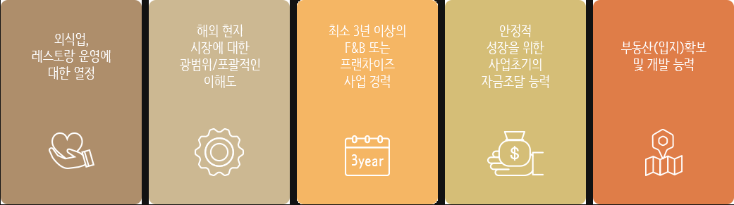 교촌에프앤비는 해외사업도 하고 있어요. 크게 직영사업과 마스터프랜차이즈(MF)로 나눌 수 가 있는데, 직영은 본사가 직접 부동산도 알아보고 인테리어도 하고 고용도 직접하는 그런 것을 의미하죠. MF는 교촌치킨을 해당 지역에 판매 할 수 있는 모든 권리를 주는거에요. 여기서 이름 값과 조리법을 빌려줌으로써 로열티를 받는거죠. 다만, 아무나 하고 싶다고 해서 교촌이 받아주는 것은 아니에요. 본사 홈페이지에 명시되어있는데, 한 번 봐볼까요.