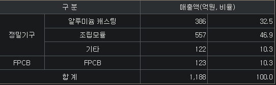 정밀기구(90%, Hinge(힌지), 스마트폰내외장재), FPCB(10%)