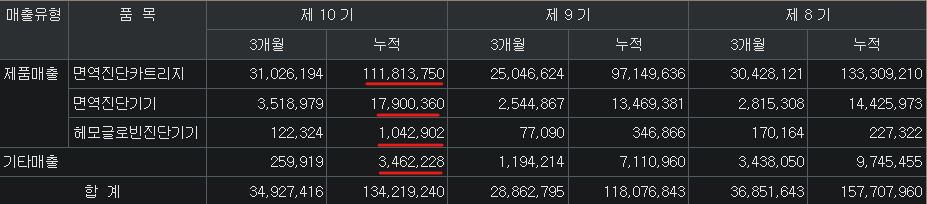 면역진단 카트리지는 면역진단 기기에서 사용되는 일회성 소모품이에요. 면역진단장비는 고정이고 카트리지만 바뀌면 다양한 진단을 할 수 있는데요. 당뇨, 심혈관, 암, 호르몬, 감염성 질병 등 90개 이상의 다른 종류의 진단을 할 수 있는 카트리지 포트폴리오를 동사는 보유하고 있어요. 특히, 코로나19때 항원진단용 카트리지로 많은 매출액, 영업이익을 올렸는데요. 동사의 강점은 코로나용 진단카트리지에 매출비중이 쏠려있는 것이 아닌 고루 분포되어있는 것이 가장 주목해야할 부분입니다.