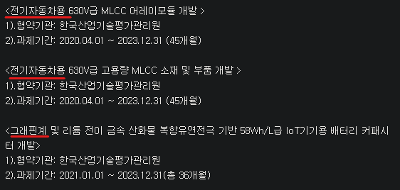 MLCC는 스마트폰에 800~1200개 정도가 들어가는데요. 전기차에는 몇 개가 들어갈까요? 약 1만개가 들어간다고 합니다. 거의 10배 수준이죠. 전기차에 한 번 MLCC를 납품할 떄 스마트폰 10대에 판매하는 것과 마찬가지이기 때문에 그 시장성은 더 크다고 할 수 있죠. 그래서 아래 R&D를 보면, 전기자동차용 MLCC를 개발하고 있는 것을 알 수 있어요.