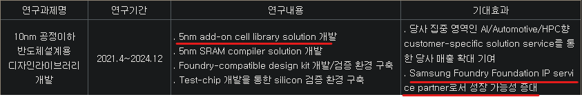 또한, 동사는 디자인 하우스이기에 팹리스 업체가 회로를 설계하고 파운드리 업체에 맡길 때, 파운드리 규격에 맞게 전환해주는 것을 기본 베이스로 해요. 결국, 칩IP, 설계 모두 파운드리가 필요하니, 파운드리 업체의 규격에 따라야겠죠. 대표적인 파운드리 업체는 TSMC, 삼성전자입니다. 에이디테크놀로지는 삼성전자파운드리향으로 시스템반도체 IP를 설계하고 있어요.