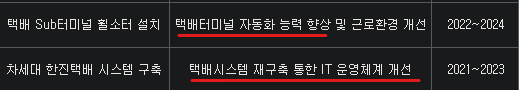 택배, 물류산업은 가격경쟁력이 굉장히 심한 산업입니다. 역설적이게도 동시에 노동집약적 산업이기 때문에 인건비로 돈이 많이 들어가죠. 또한, 점차 소비자들이 당일배송에 익숙해지다 보니 택배물류회사들 입장에서는 원가경쟁력+신속성+정확성까지 모두 갖춰야지 살아남을 수 있게 되었어요. 이를 실현해줄 있는 것이 자동화설비이고 아래 동사의 투자내역을 보더라도 자동화설비에 투자하는 것을 알 수 있어요.