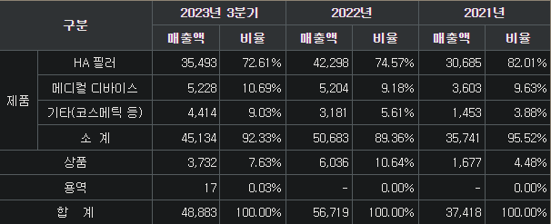 HA 필러(73%, Hyaluronic Acid=얼굴적용), 기타(10%, 필러적용=유착방지제, 관절조직수복제, 방광용조직수복제), 화장품(11%) / R&D : 보툴리눔 톡신, 비만&당뇨치료제, 항바이러스치료제