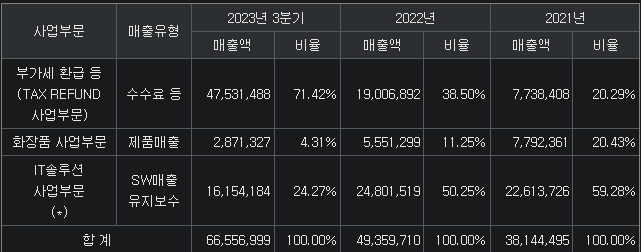 세금환급대행(72%, 공항환급,시내환급,즉시환급), S/W(24%, 대량데이터=결제데이터 등, A/S), 화장품(4%, 자회사 스와니코코) / 사업지역 : 국내, 프랑스, 싱가폴, 일본 / 자회사 : 스와니코코(화장품), 핑거스토리(웹툰)