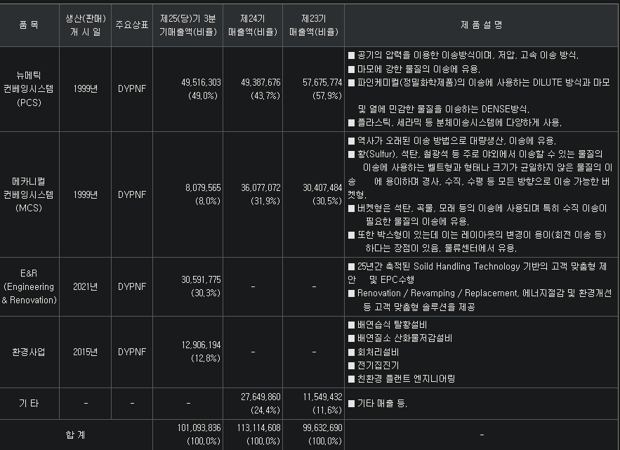 * 매출유동적 / 공기압력식 분체이송시스템(50%, 석유화학,이차전지), 기계식 분체이송시스템(8%, 석탄,곡물,모래), EPC(43%, 플랜트설비) / 거래처 : LG화학, 코스모화학, 두산에너빌리티, 롯데건설, SGC이테크건설 / 비중 : 석유화학5>이차전지3>발전1.5>광물0.4