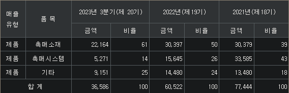 촉매(61%, 환경유해물질 저감=NOX, PM, CH, CO), 촉매시스템(14%, 매연저감장치), 기타(25%, 양극재용 전구체) / 신사업 : 양극재 전구체