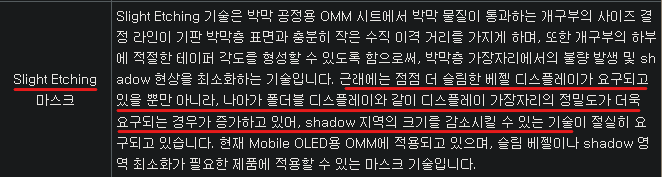 LCD와 비교해서 OLED의 가장 큰 장점은 유연하다는 것이에요. 스스로 빛을 내는 유기물들 때문에 뒤에 백라이트 같은 것도 필요가 없어서 두께도 얇고 접었다 폈다 할 수 있을 정도로 유연성이 뛰어나죠. 다만, 이를 만드는 공정차원에서는 난이도가 더 올라갑니다. 메탈마스크 같은 경우는 정확히 증착을 하는 것이 목적인데 패널(Panel)이 다양하게 생기고 구부러지다 보니 난이도가 올라갔어요. 하지만, 이를 해내는 것이 경쟁력이겠죠. 동사는 Slight Etching이라는 메탈마스크의 미세식각을 통해 점점 슬림해지는 패널을 대비하고 있어요.