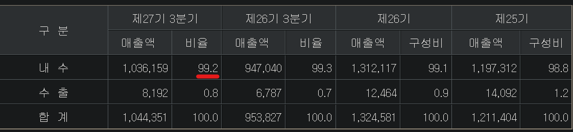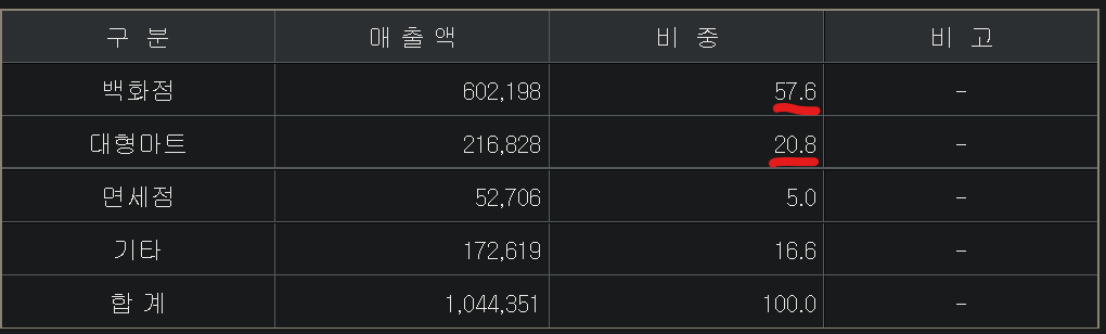 아무리, 한국이 세계 명품시장 규모7위 그리고 그 시장 규모도 커지고 있다고 보더라도 한국에만 의존한다면 리스크가 크다고 볼 수 있어요. 만일, 한국인들이 지갑을 닫는다면 신세계인터내셔날의 매출은 0제로라고 봐도 무방합니다. 아래 매출 비중을 먼저 보고 가시죠.