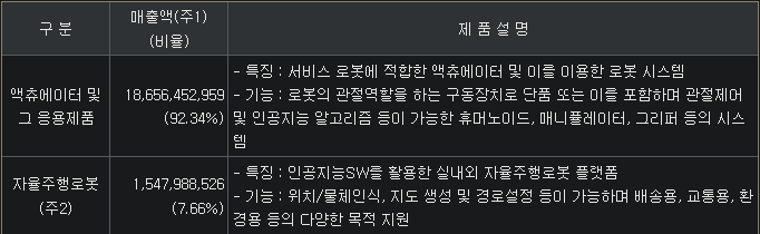 로봇액츄에이터(92%, 구동장치=모터-통신--제어기-감속기 for 다이나믹셀), 실내외자율주행로봇(8%, 개미-GAEMI) / 경쟁력 : LG전자(2대 주주), 실내외 자율주행로봇