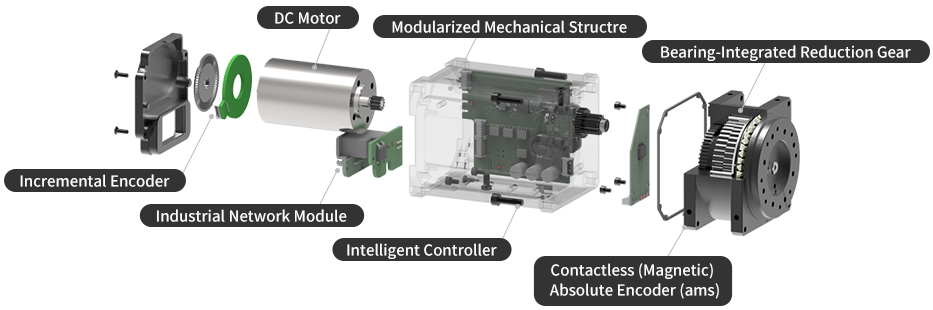 전에는 제어기와 모터를 직접 연결하여 통신을 했는데요. 이는 확장성이 부족해요. 최근에는 모터, 감속기, 제어기 등에 각각 고유ID를 부여하여 따로따로 통신하도록 만드는 것이 추세죠. 그러면, 개별적으로 조작이 가능해 확장성을 늘릴 수가 있게돼죠. 즉, 모터,감속기,제어기,통신 등을 각각의 고유 ID를 부여하고 하나로 뭉쳐 모듈화시킨 것이 '다이나믹셀'인 것이에요.