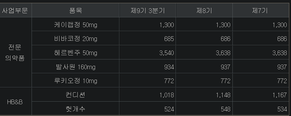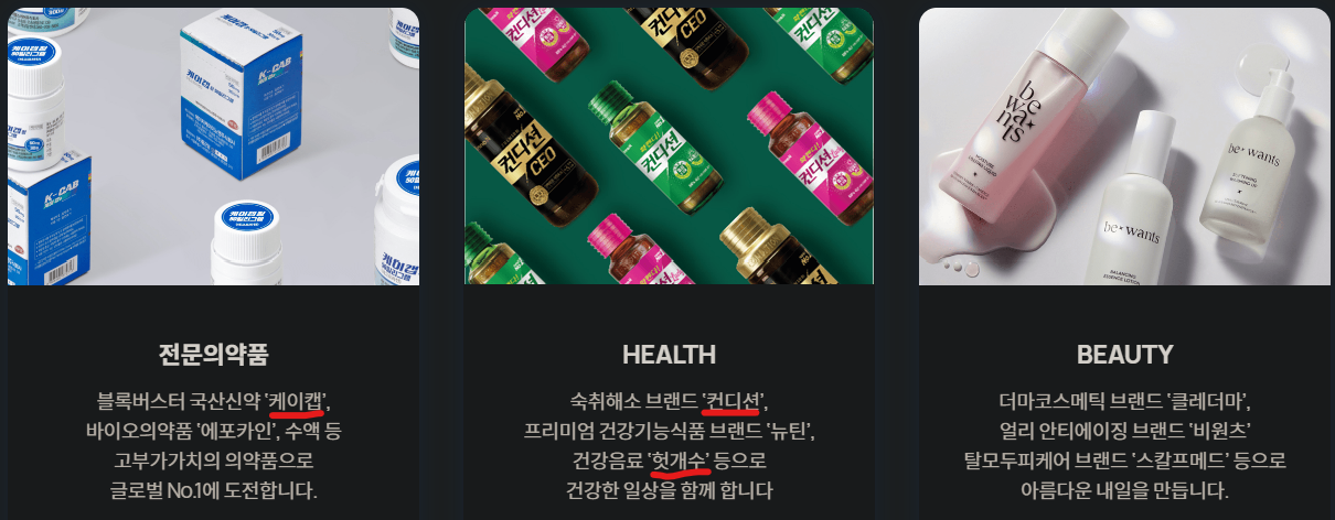 3. 상품 : 케이캡(위식도역류질환치료), 헤르벤(고지혈증치료), 영양수액(혈액영양공급) 위주