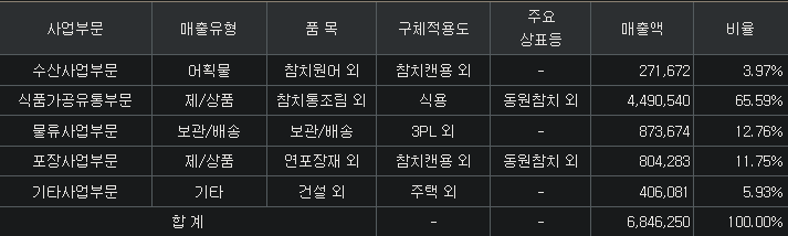 2. 자회사 : 동원F&B(참치캔, 조미식품, 배합사료), 동원시스템즈(알미늄, 연포장, PET, 유리병 등), 동원로엑스(물류)