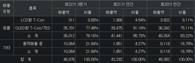 OLED T-Con(78%, 타이밍 조절 for DDI in 가로, 세로), LCD T-Con(1%), 용역(21%) / 거래처 : SDC