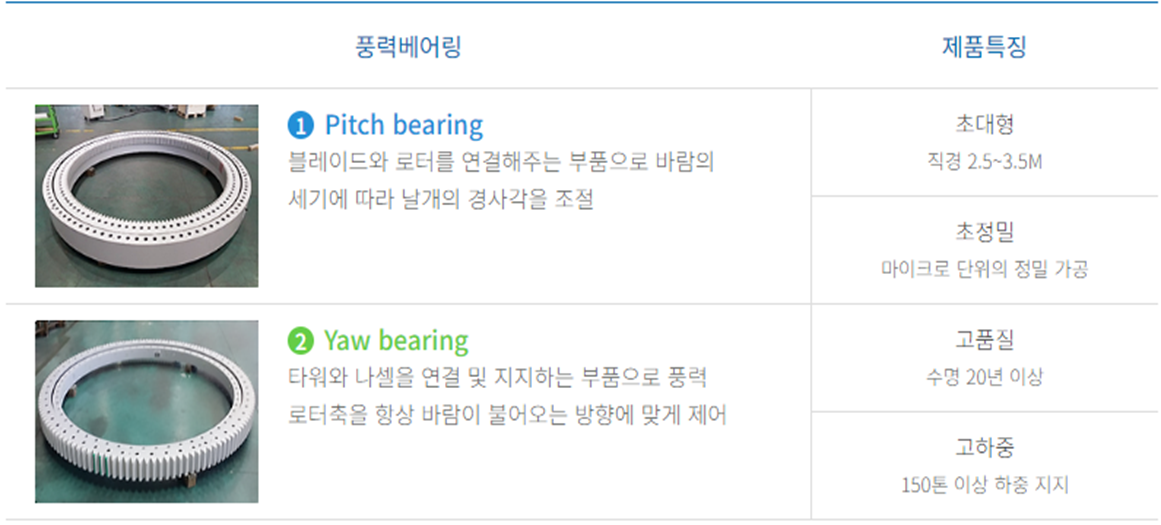 우선, 씨에스베어링은 사명 그대로 '베어링(Bearing)'을 만드는 업체에요. 베어링은 '견디다'라는 뜻이에요. 풍력발전기에서 쓰이면, 다른 부품(터빈, 로터)들이 잘 작동하도록 지지해주고 회전시켜주는 역할을 하죠. 베어링의 종류는 Pitch, Yaw 2가지로 나뉘어요. Pitch는 바람의 세기에 따라 블레이드의 경사각을 맞춰주는 것이에요. 바람이 쌘 쪽으로 경사각을 맞추는 역할을 하죠. Yaw 베어링은 블레이드가 서쪽을 바라보고 있는데, 바람이 동쪽에서 불어올 때 회전 시켜주는 역할을 해요. 구체적으로 말하면, 로터(Rotor) 축을 돌려서 바람이 불어오는 방향으로 얼굴을 갖다 대죠.