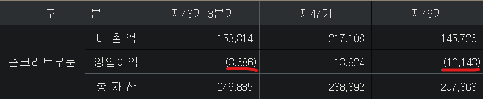 다만,콘크리트 제품 같은경우 크고 무겁기 때문에 운반비가 많은 비용을 차지합니다. 영업이익 같은경우 20년과 22년3분기에는 적자를 기록했어요. 20년엔 101억원, 22.3분기 누적 적자는 36억원 정도이죠. 아무래도 골재가격과 시멘트, 철근 등 모든 가격이 상승한 것 + 운반비용(기름값, 인건비 상승)이 영향을 미친 것 같습니다. 다만, 21년에는 139억원 정도 흑자인데, 영업이익률이 6.4% 정도 나오네요.