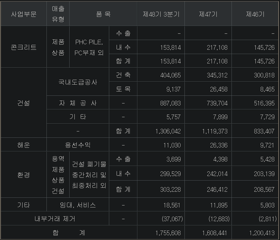 3. 콘크리트사업, 건축&주택 사업 내수 100% / 환경 내수 98.8%, 수출 1.2% :