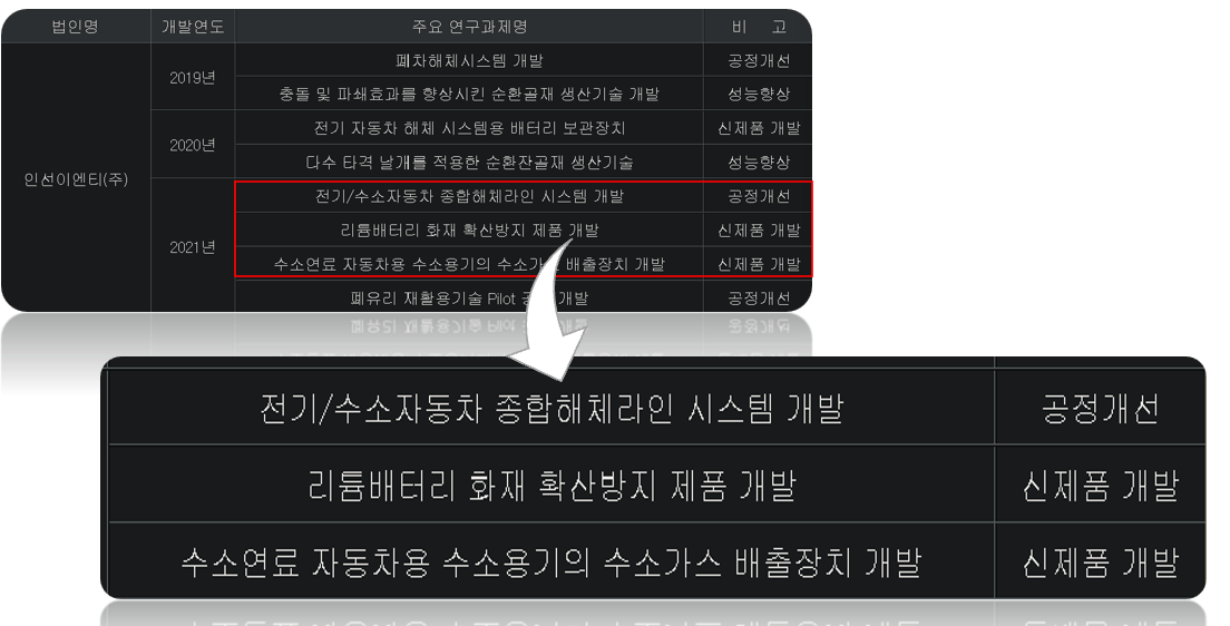 자회사 인선이엔티의 최근 연구실적만 보더라도 말뿐만은 아닌 것을 알 수 있어요. 내연기관자동차를 단순 해체만 하는 것이아니라 전기차, 수소차량까지 해체하여 그 안에 값어치가 있는 배터리 같은 것들 까지 재활용하려는 포부가 보여요.