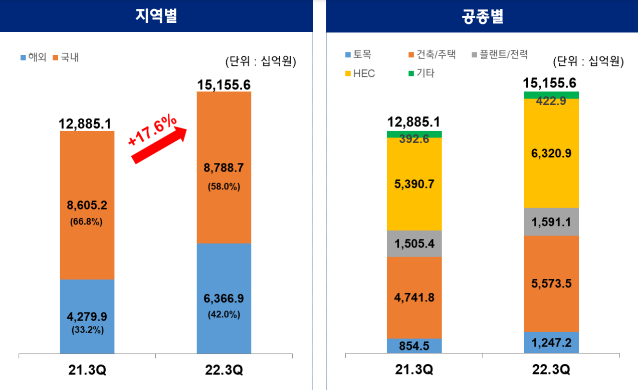 2022, 중동의 쿠웨이트(슈웨이크 항만 추가 건설 및 개보수 공사), 아시아의 필리핀(남부도시철도 4, 5, 6공구) 신규 공사 수주하였으며, 사우디(네옴 러닝터널, 삼성물산과 협업) 사우디, UAE 등 대규모 신도시 개발 및 인프라 사업 참여 확대(네옴 신도시 중점) 현대건설의 경우 글로벌 건설사 순위 20위권 중 유일하게 국내 건설사 중 순위 13위에 올라와있는만큼 역량을 보이고 있습니다.