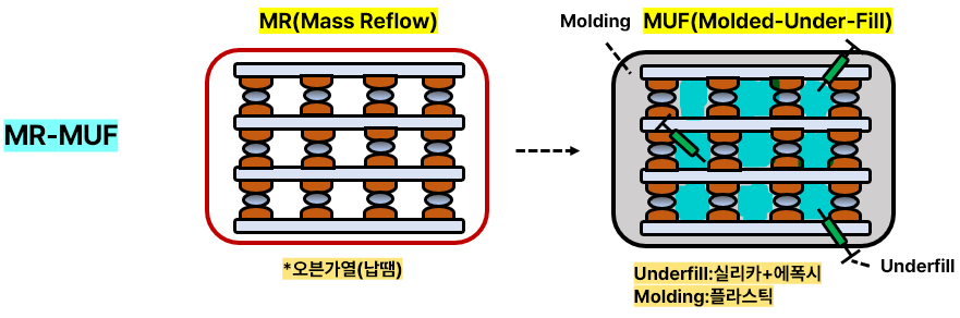MR-MUF(Mass Reflow - Molded UnderFill) : Mass Reflow(범프 납땜 in 오븐), MUF(플라스틱 몰딩 + 액체형 에폭시&실리카 언더필)
