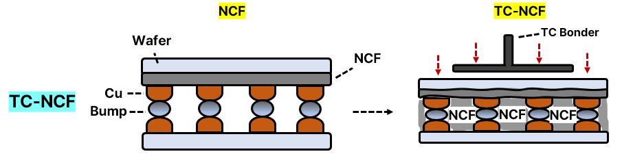 * 원리 : NCF 부착 on 웨이퍼 > TC Bonder 열압착 on 웨이퍼 > NCF 녹음 Between 웨이퍼s for 결합