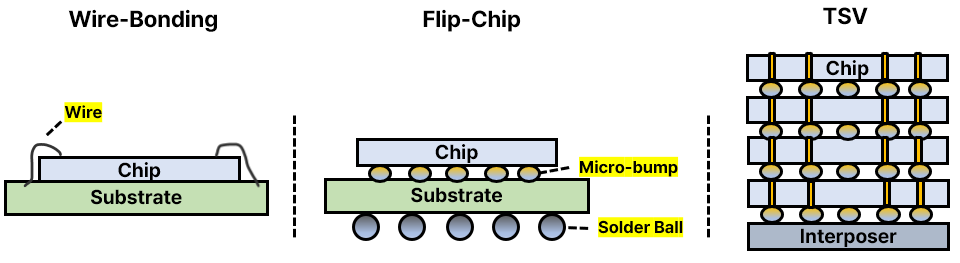 우선, TSV(Through Silicon Via), 와이어본딩(Wire-Bonding), 플립칩본딩(Flipchip-Bonding)부터 알고 가죠. 기존 와이어본딩, 플립칩본딩은 칩과 기판을 연결하는 것이 목적이었어요. 칩과 칩의 연결은 HBM 처럼 칩을 적층하는 개념이 생겨나면서 나타난 아이디어인데요. 이를 TSV(Through Silicon Via)라고 부릅니다. 웨이퍼는 실리콘(Si)으로 만들어졌고 이를 관통(Through Via) 한다고 하여TSV라고 부르는 것이죠.