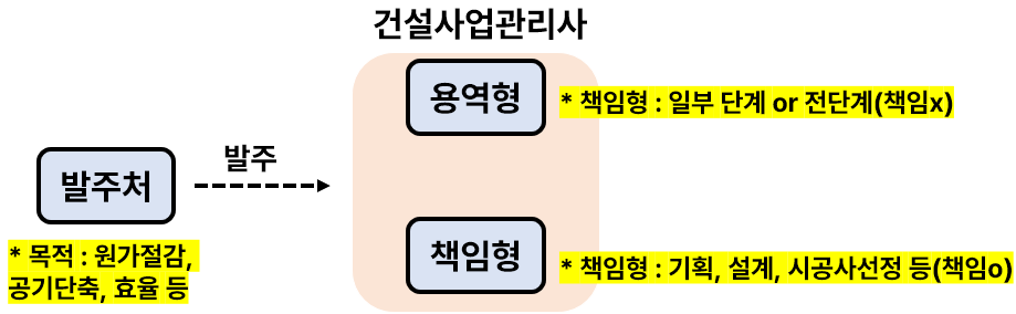 건설사업관리(CM, Construction Management) : 용역형(책임x), 책임형(책임o) > 역할 : 프로젝트관리, 원가절감, 시공단축, 공기단축(공사시간), 예산관리 for 발주자(거래처)