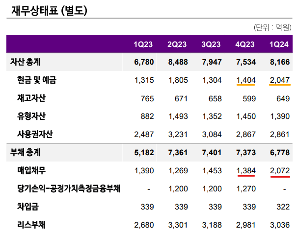 문제는 컬리의 매입채무가 빠르게 증가했다는 것이에요. 아래 표를 보면, 24년 1분기 실적에서 매입채무가 1,384억원에서 2,072억원으로 +49.7% 증가 했어요. 앞서 설명했듯이 매입채무가 증가했다는 것은 셀러들의 제품을 매입해놓고 정산을 늦게해주어서 '채무'로 쌓인 것이죠. 돈이 어디 가지는 않았겠죠? 마켓컬리의 현금으로 쌓입니다. 아래 '현금 및 예금'란을 보면, 1,404억원에서 2,047억원으로 +643억원(45.7%) 개선된 것을 알 수 있어요. 이러한 현금을 통해 컬리는 시세 확장을 하려고 하는 것으로 보여요.