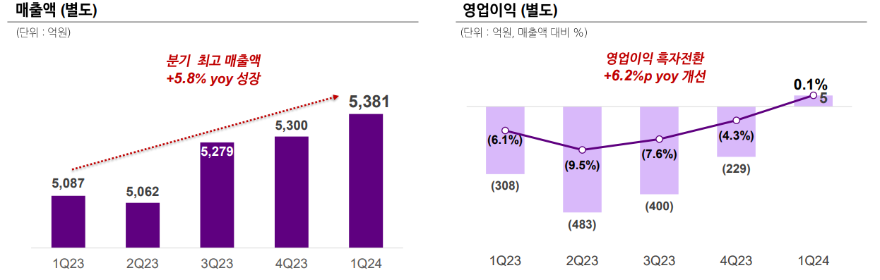 결론적으로 신규투자유치도 최대주주들의 눈치로 받기 힘들고 매입채무로 발생한 현금흐름 개선도 어려울 것으로 보여요. 결국 남은 것은 '본업'을 잘하는 것입니다. 컬리는 식품전문플랫폼에서 비식품(뷰티 등), 3PL(제3자 물류)로 매출 다변화를 하고 있어요. 컬리 입장에서 희망적인 것은 1Q24 실적에서 첫 분기흑자를 기록했다는 것이에요. 물론, +5억원의 영업이익흑자로 적은 액수이지만, 하나의 전환점이 될 지는 지켜봐야할 것 같아요.
