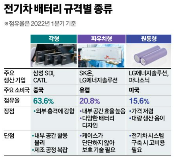 여기서 잠깐! 배터리공간을 잘 활용해야한다고 말했죠. 전기차배터리를 만든다고 해서 다 같은 모양을 가지고 있는 것은 아닙니다. 전기차배터리업체마다 추구하는 배터리모양이 다르죠. 예를 들면, LG에너지솔루션 : 파우치형, 원통형 / SK온 : 파우치, 각형 / 삼성SDI : 각형, 원통형이에요.