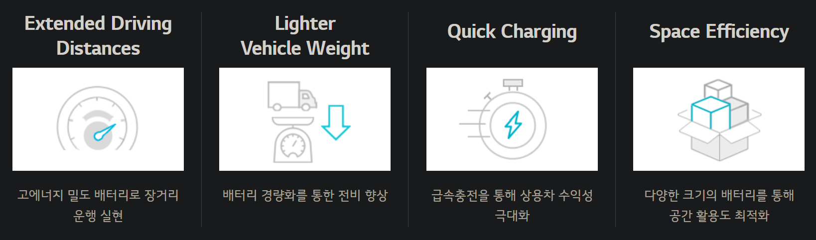 - 셀을 적층형식으로 쌓아가기에 에너지밀도가 높음 -> 장거리주행 가능